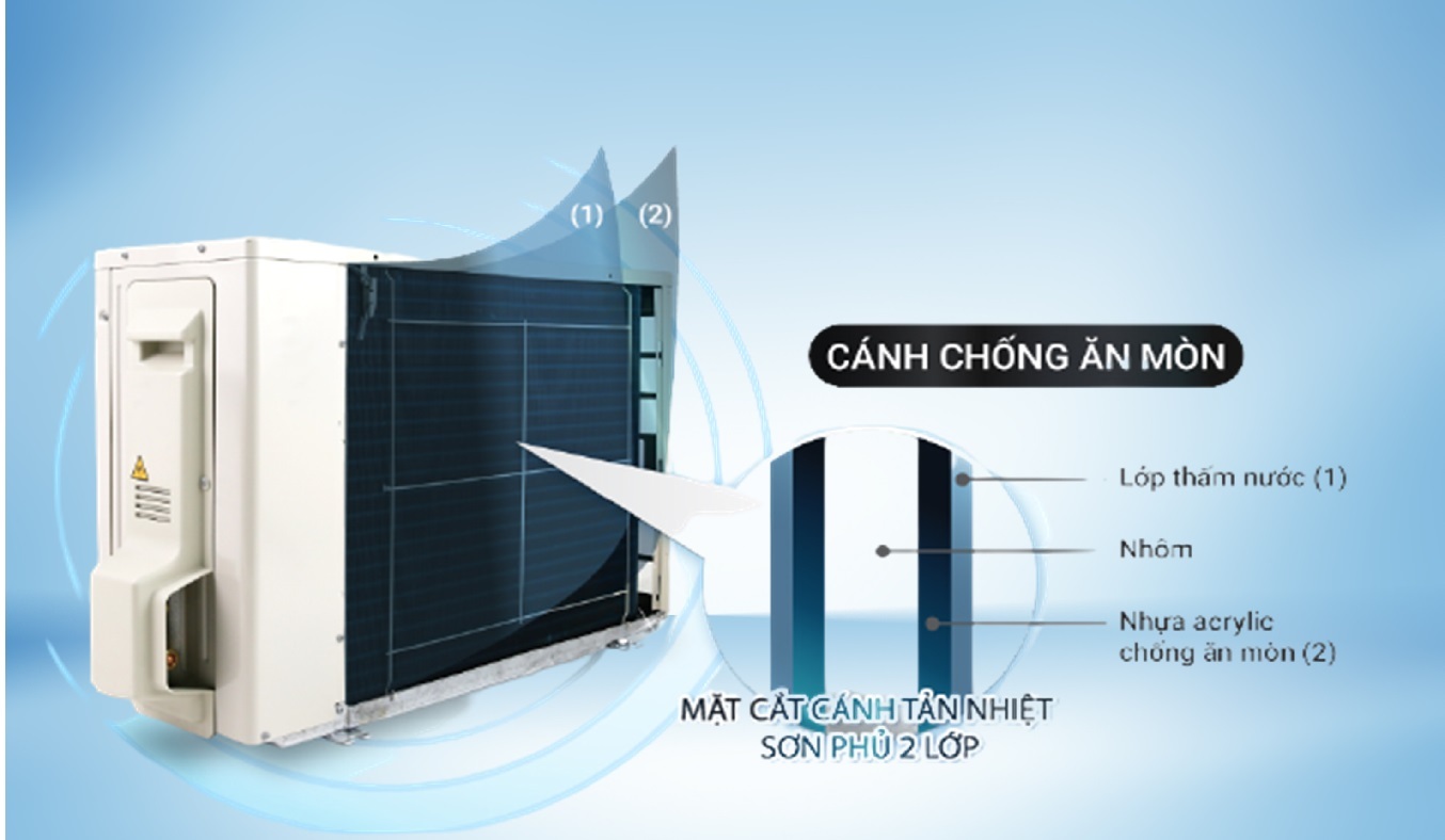 Cánh trao đổi nhiệt của dàn nóng máy lạnh Daikin Inverter 2 HP FTKA50UAVMV được phủ lớp phủ 2 lớp tĩnh điện chống ăn mòn đặc biệt giúp máy hoạt động bền bỉ trong thời gian dài. Ngoài ra, máy lạnh Daikin còn có bảo vệ bo mạch điện áp cao thấp, có thể chịu được dao động điện áp cao và thấp hơn so với các bo mạch bình thường.