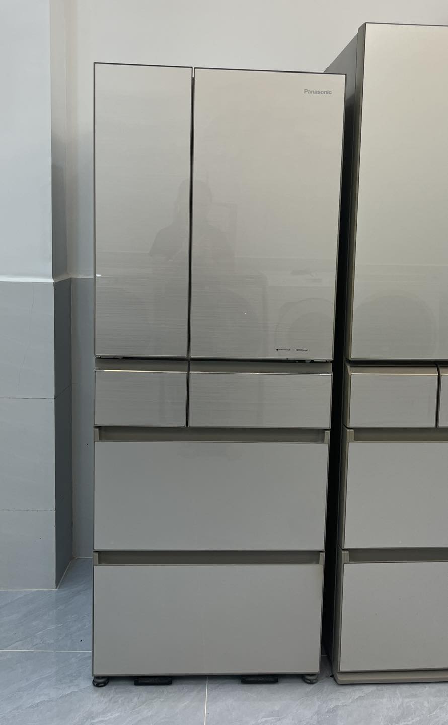 Tủ lạnh Panasonic NR-SPF454X-N nội địa Nhật Bản được thiết kế hiện đại với mặt gương pha lê cường lực màu vàng cát.