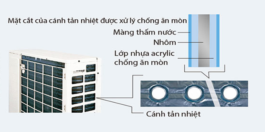 Bề mặt cánh tản nhiệt dàn nóng loại này được phủ lớp nhựa Acrylic, có khả năng chịu được mưa axit và hơi muối. Kế đến là lớp màng thấm nước giúp hạn chế gỉ sét, tăng độ bền cho sản phẩm.